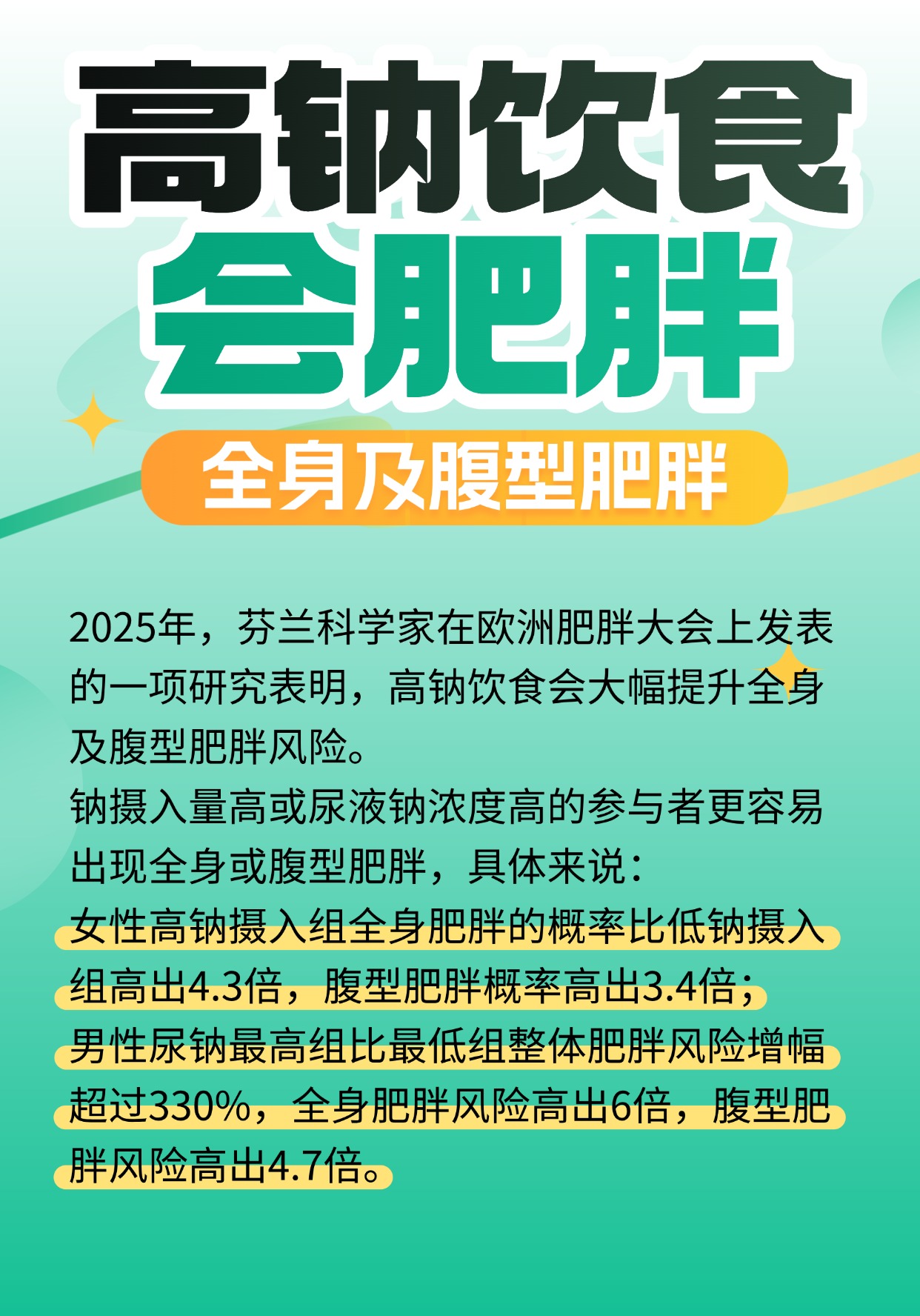 高钠饮食会大幅提升全身及腹型肥胖风险