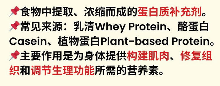 - 植物蛋白 (Plant-based Protein): 常见来源有大豆、豌豆、糙米等。