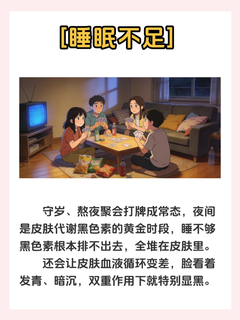 3 熬夜守岁、打牌,睡眠不足,黑某素代代变慢,容易堆积