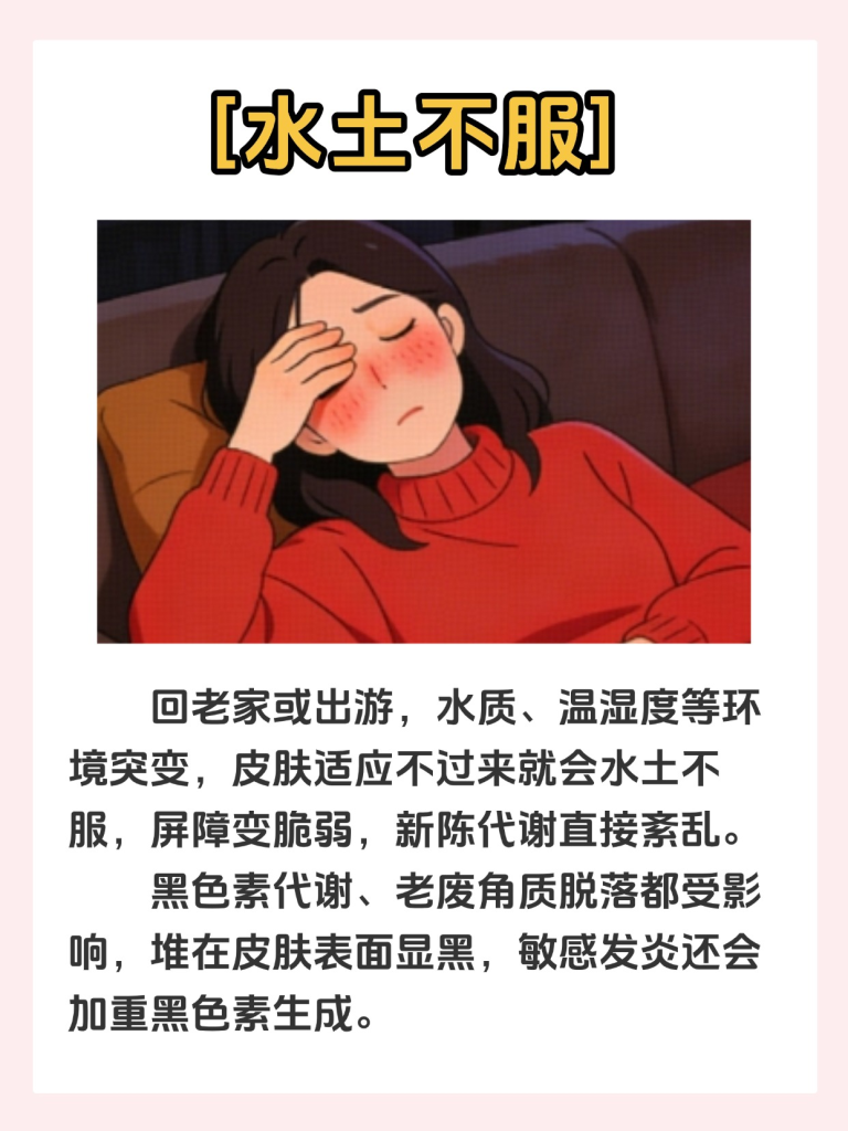 4 突然换环境,水土不服,影响肌肤新陈代代,肤色容易变暗沉