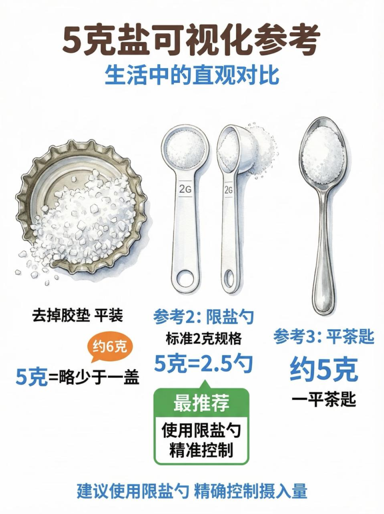 《中国居民膳食指南》及世卫组织(WHO)建议 : 成年人每天盐摄入量不要超过5g,相当于一个啤酒瓶盖的量