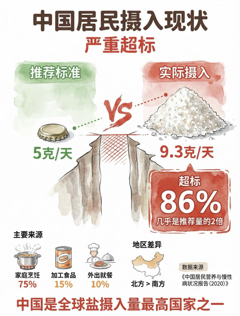据《中国居民营养与慢性病状况报告》显示 中国居民每天盐摄入量高达9.3g,几乎是推荐量的2倍!