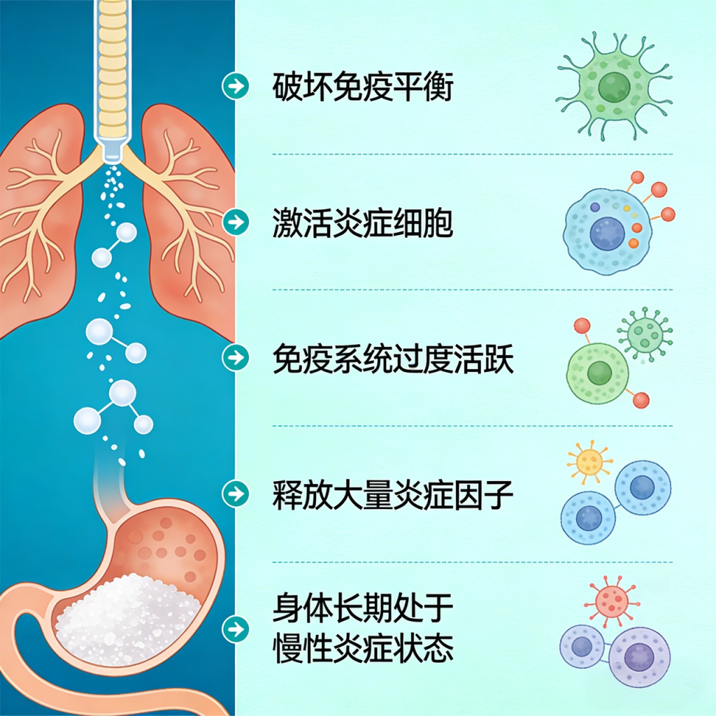 高盐饮食会破坏肠道菌群平衡,导致肠道屏障受损,有害物质更容易进入血液,从而触发全身的炎症反应