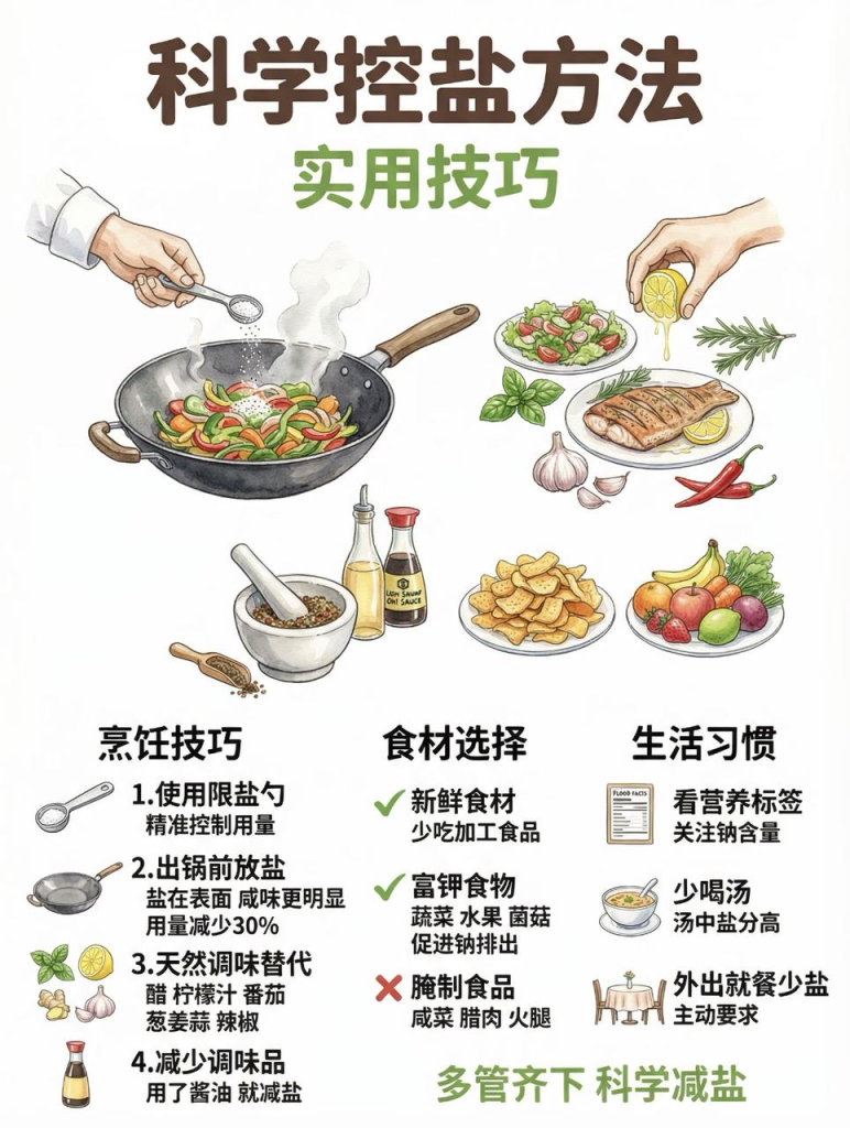 改变烹饪顺序,临出锅再放盐,或使用天然调味品替代盐