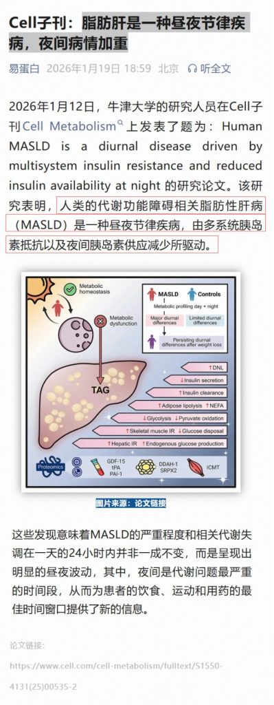 2026年《Cell》子刊的论文表明:脂肪肝是一种昼夜节律疾病,夜间病情加重